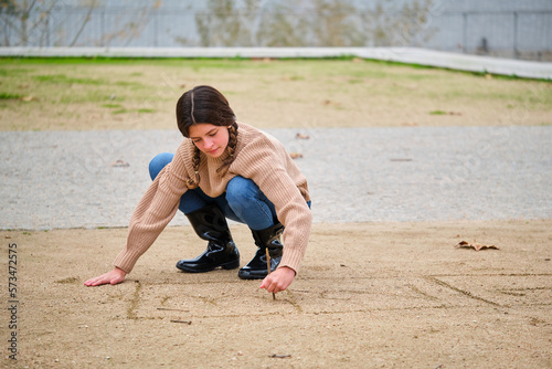 girl, 2, braid, draw, hopscotch, sand, stick, outdoors, children, game, children, number, fun, play, childhood, outside, lifestyle, caucasian, spanish, preteen, autumn, leisure, schoolgirl, fall, drawn, avocation, september, october, november