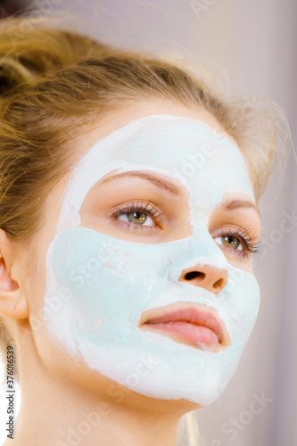 Girl with white green mud mask on face