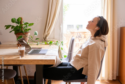 girl working at home. Girl leaning on the chair and letting her arms drop from exhaustion