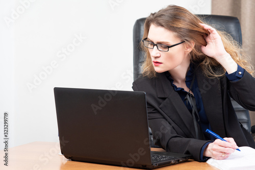 Girl works with a laptop. Accountant fills out a report. Woman s