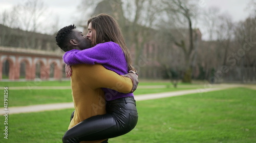Girlfriend jumping in boyfriend arms. Interracial couple romance