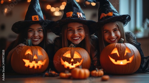 Girls Celebrating Halloween with Pumpkins and Costumes