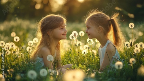Girls on grass with dandelions in summer.