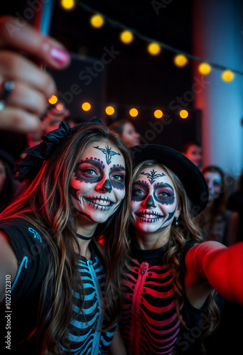 girls smiling taking a selfie at a Halloween party, dressed up, spooky make up
