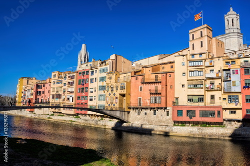 catalonia, spain, panorama, city landscape, bridge, river, spanish, flag, house, aged