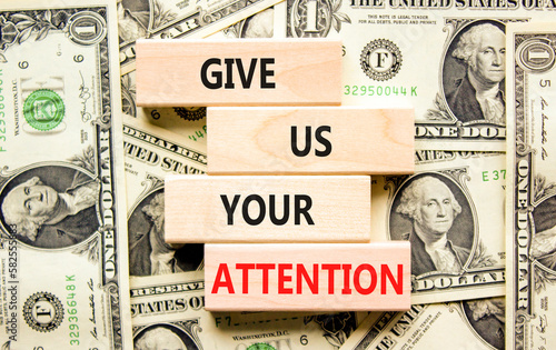 Give us your attention symbol. Concept words Give us your attention on wooden block. Beautiful background from dollar bills. Motivational business give us your attention concept. Copy space.