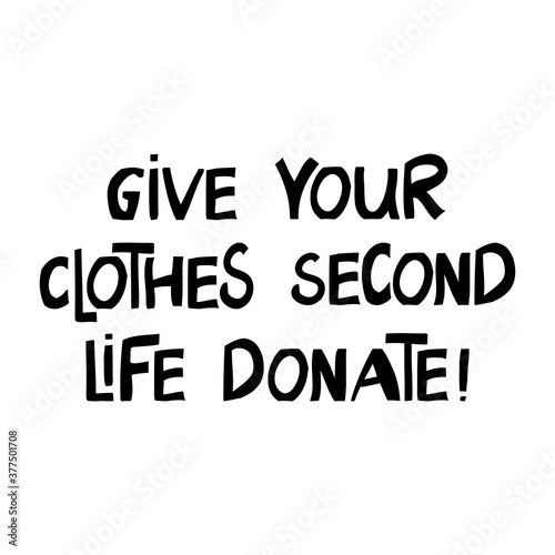 Give your clothes second life, donate. Motivational quote about zero waste lifestyle and eco problems. Scandinavian, hand drawn ink lettering. Isolated on white background. Vector stock illustration.