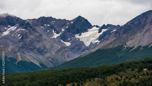 glacier view from the mountain range in Tierra del Fuego close to Ushuaia, Argentina, South America