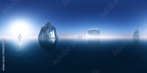 Glaciers in the ocean, icebergs in the sea,. Environment map. HDRI map. Equirectangular projection. Spherical panorama. landscape 3d rendering