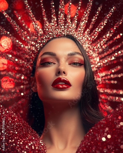 model, glamour, beauty, portrait, fashion, make-up, red, glistering, shine, elegance, coiffure, headdress, creativity, artistry, light, sparkle, cosmetic, studio, expression, confidence, headpiece, design, dream, inspiration, high-coloured, charisma, striking, allure, stunning, mystique, closeup, radiant, celebration, sophisticated, female, youthful, luxury, artistic, festive, emotional, bold, captivating, aesthetic