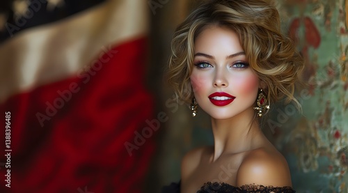 Glamorous young woman with wavy blonde hair, red lipstick and evening makeup poses against textured wall background. Elegant portrait with dramatic lighting and romantic mood.