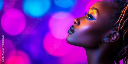 Glamour in Neon Lights: A captivating portrait of a confident woman with bold makeup and intricate dreadlocks, bathed in a vibrant, neon-hued backdrop. Her gaze is intense.