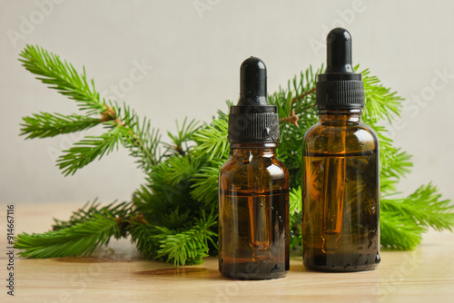 glass amber bottles with pipettes and spruce branches with young needles