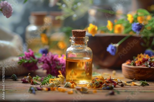 Glass bottle containing essential oil with cork cap, placed on a wooden surface amidst scattered dried flowers and herbs, creating a natural and aromatic scene