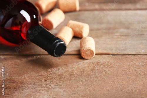 Glass bottle of wine with corks and corkscrew