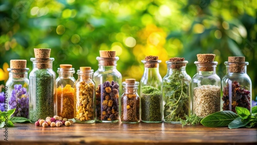Glass bottles filled with assorted medicinal herbs , alternative medicine, health, herbal remedies, natural