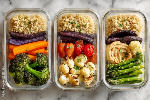 Glass containers filled with cooked quinoa, hummus, and colorful roasted vegetables like zucchini, peppers, and onions, representing healthy plant-based meal prep for World Vegetarian Day.