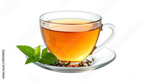 Glass cup of amber tea with mint garnish on white saucer