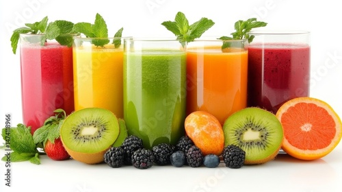Glass cups hold a row of smoothies made from various fruits, including orange and kiwi