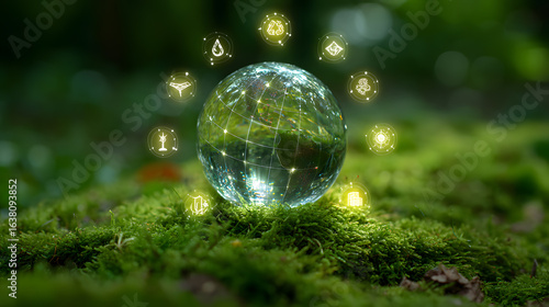 Glass Earth Globe with Sustainability Icons on Mossy Ground