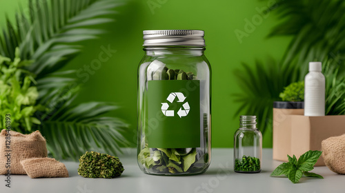 Glass Jar Filled With Raw Materials Labeled 'Zero Waste Production' and Eco-Friendly Product Samples