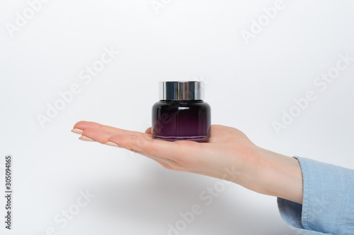 glasses, hand, cream, bottle, lotion, jar, beauty, skin, woman, female, background, care, hygiene, isolated, white, cosmetic, spa, treatment, product, closeup, copy, space, text, clean, holding, health, arm, wellness, aroma, cap, hold, light, apply, beautiful, medicine, moisturiser, moisturise, smooth