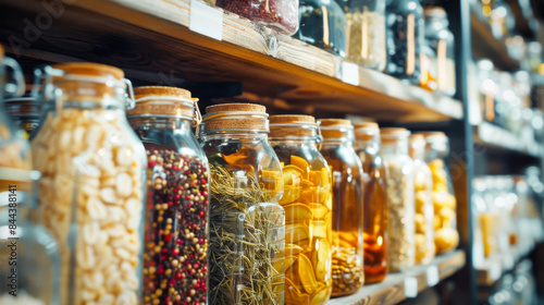 Glass jars and bottles on shelves, containing natural organic food ingredients