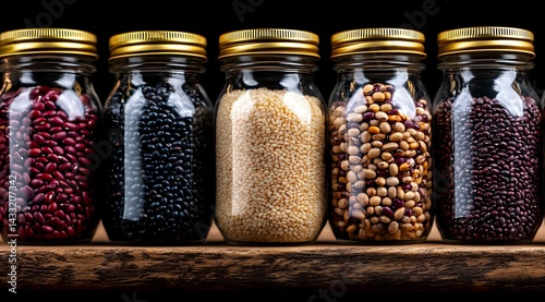 Glass jars filled with colorful dried legumes and grains on wooden surface against dark background, showcasing variety of beans, quinoa and pulses for healthy cooking.