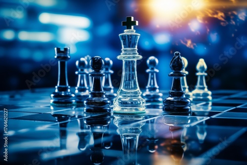 Glass king chess piece is leading dark chess pieces on reflective chessboard with dramatic lighting, symbolizing leadership, strategy, and competition