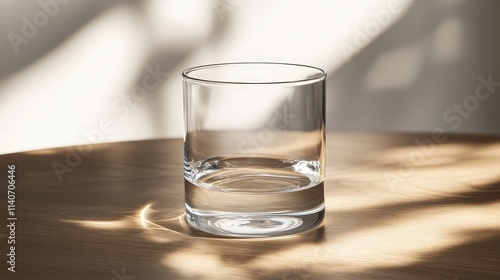 glass of crystal-clear water sitting on a wooden table with a hint of sunlight shining through
