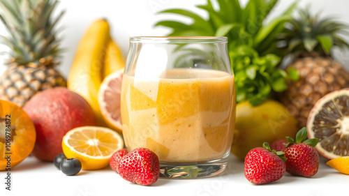 Glass of fresh smoothie and fresh orange and strawberrys on pink, white and wooden background. Healthy food and drink concept.
