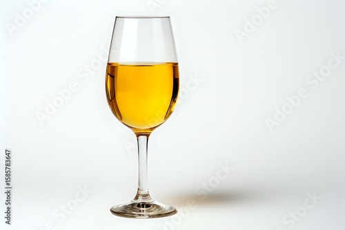 Glass of golden white wine on white background with soft shadow, elegant stemware isolated for restaurant menu, beverage advertising and wine tasting promotion.