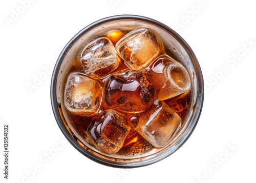 Glass of iced cola soda isolated on transparent background - A refreshing glass of cola soda with ice cubes, showing bubbles and condensation, isolated on a white background. Perfect for beverages and