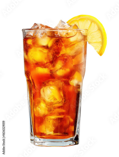 Glass of iced tea with lemon slice and ice cubes on transparent background