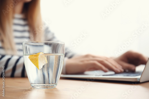 Glass of water on table of woman working on laptop