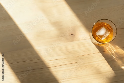 Glass of whiskey with ice cube on wooden table casting dramatic diagonal shadows in sunlight, creating minimalist composition with warm tones.
