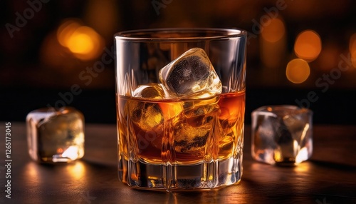 Glass of whiskey with ice cubes on a wooden table, warm ambiance in the background.