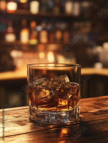 Glass of whiskey with ice on a wooden bar counter in a dimly lit pub setting. Generative AI