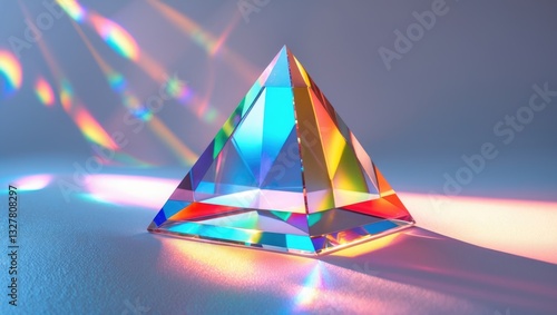 Glass pyramid prism reflecting colorful sunlight on background with space for text