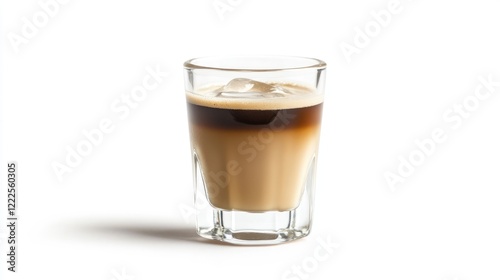 hot drink, iced, drink, layered, glasses, beverage, caffeine, shot, espresso, cream, milk, ice, cube, cold, refreshment, delicious, tasty, summer, morning, afternoon, energy, stimulant, brown, light brown, clear, transparent, isolated, white, background, studio, photo, food, cookery, sweet, bitter, aroma, fragrance, texture, smooth, creamy, chilled