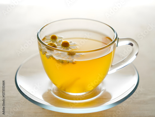 Glass Teacup with Bright Yellow Chamomile Tea on a White Saucer, Fresh and Inviting