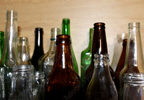Glass waste for recycle. Empty glass bottles from beer wine and champagne. Ecology and environment concept. Glass bottle recycle. Glass bottles for reuse. Bottles waste reusable material.