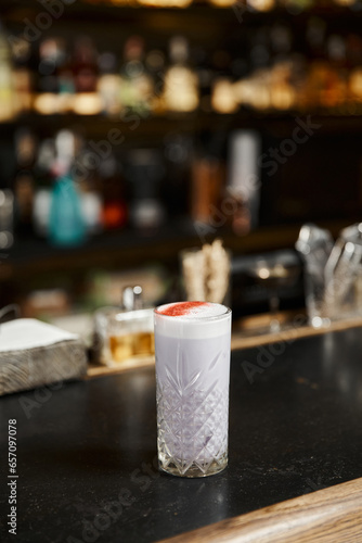 glass with classic milk punch flavored with cinnamon on bar counter, cocktail presentation