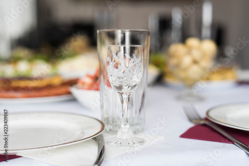 Glasses goblets on white table. Room with table serving fruits and dishes and meal.