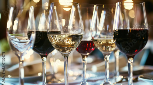 Glasses of red and white still wine on restaurant table, wine tasting event