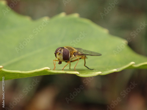 Glass-winged hover fly (Syrphus vitripennis), female sitting on a green leaf