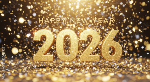 new, year, happy, 2026, gold, confetti, glistering, shine, light, sparkle, festive, celebration, holiday, event, eve, cheer, december, jan, time, future, welcome, bright, illuminated, metallic, texture, background, abstract, design, typography, lettering, greeting, card, banner, poster, announcement, party, moment, season, wish, hope, dream, resolve, luxury, elegant, black, sharpened, render