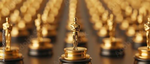 Gleaming Trophies Display Gold Statuettes on Reflective Platform - Premium Event Decor and Corporate Recognition for Timeless Branding and Legacy Enhancement