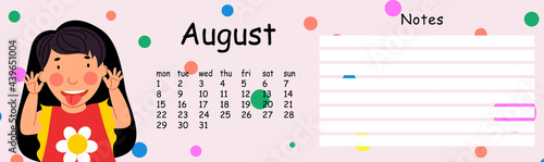 Glider wall calendar template for the year 2022 month of August. A cute child makes a grimace, shows his tongue. The week starts on Mondays. Flat cartoon style.