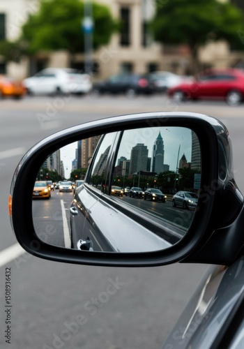 Glimpses of traffic and modern city skyline appear in the shiny side mirror of a passing car.
